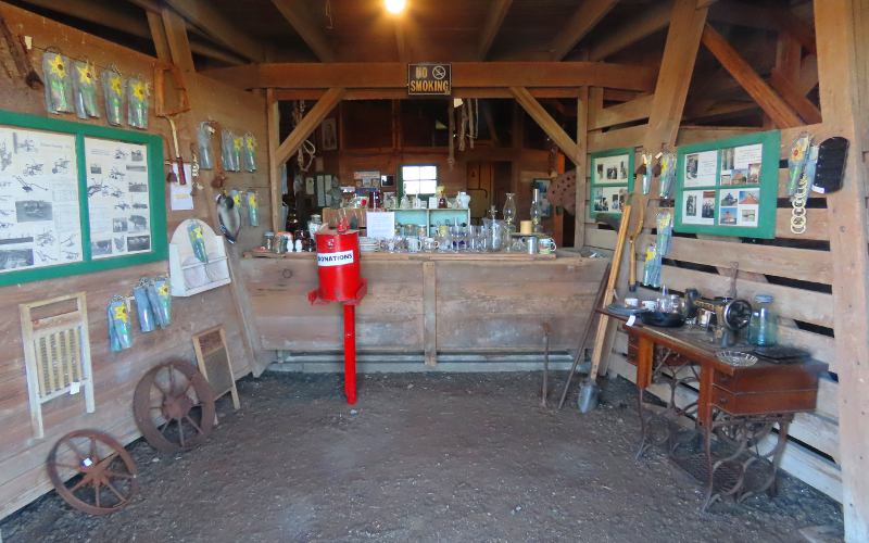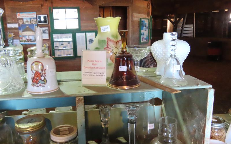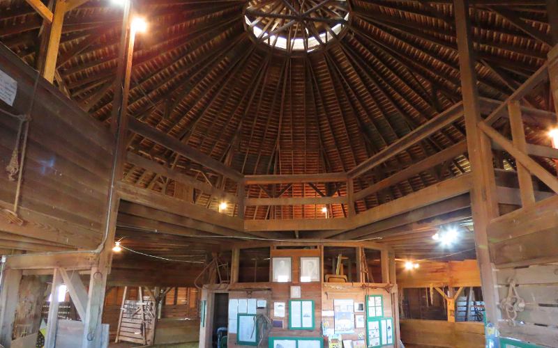 Fromme-Birney Round Barn - Mullinville, Kansas I pleasantly surprised when I visited the Fromme-Birney Round Barn, south of Mullinville, Kansas, for the first time. Built in 1912, the 50 feet tall, 70 feet diameter, 16 sided barn was built in 1912 to hold draft horses. As the working horses were replaced by tractors, the "round" barn was used to store hay. The barn was listed as the Fromme-Birney Round Barn on the National Register of Historic Places in 1987. In 1993 it was given to the Kiowa County Historical Society and in 1995 the Fromme-Birney Barn was restored using a Heritage Trust Fund grant. The Fromme-Birney Round Barn is always open to the public, free, and includes a number of displays and exhibits. Visitors are invited to open the door, turn on the lights, sign the guest book, and view the exhibits of farm life of 1912. (please turn off lights when you leave.) There are postcards, original roof ridge caps from the barn and items you might find in a flea market sitting out for sale, trusting visitors to pay on the honor system. Round Barn T-shirts can be purchased at the Mullinville Cleaners, 101 S Main Street, Mullinville (620) 548-2373. To reach the Fromme-Birney Round Barn, follow the signs south from the intersection of Main Street and U. S. Highway 54 in Mullinville. 3.5 miles south on a paved road, and 1.75 miles west on a gravel road. The barn received a new roof in 2022 and the new roof matches the green color from the original 1912 shingles.