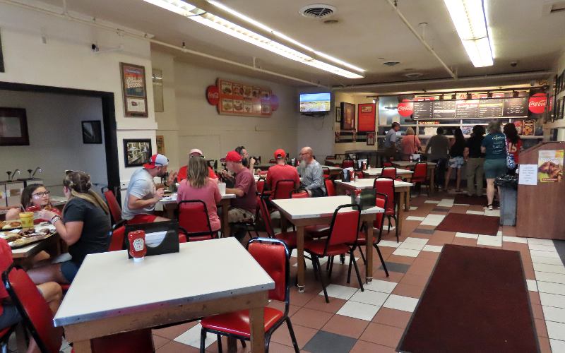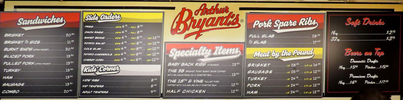 Arthur Bryant's Barbeque - Kansas City, Missouri Arthur Bryant's Barbeque at 18th & Brooklyn in Kansas City, Missouri was once the most famous Kansas City BBQ restaurant and one of the most famous in the country. Its history can be traced from Henry Perry, "the father of Kansas City barbecue." Henry Perry began serving smoked meats to Kansas City Garment District workers from an alley stand in the early 1900s. He later moved his stand into a series of buildings in the 18th & Vine Jazz District. Arthur Bryant and his uncle Charlie worked for Perry and Charlie took over the restaurant when Henry Perry died in 1940. In time, Arthur took over the operation. Arthur Bryant's barbecue restaurant moved to this location a few blocks farther east at 1727 Brooklyn in 1958. When Arthur died in 1982, the restaurant was closed for 2 years before being reopened by his niece, Doretha Bryant, and other partners. No members of the Bryant family have been involved with the restaurant for many years. At one time, I traveled to Arthur Bryant's several times a year, but Kansas City barbeque has come a long way in the past 40 years and I now only get back there once a year or less. The product at Bryant's is little changed since my first visit in 1985, but Kansas City barbecue has matured and tastes change. That said, Bryant's has been expanding their menu and some of the newer items like chicken wings and baby back ribs are very good. Perhaps this old dog is learning some new tricks. My usual order is a huge combination sandwich with a lot of pork and beef on a double deck sandwich made with a third slice of white bread between the two meats. It would easily be enough for three sandwiches. That is a good thing - at $20.50 it feels like you are paying for two. Many people get a sandwich or ribs with fresh cut french fries cooked in lard. Arthur Bryant's has three sauces: original (which can still sometimes be seen aging in large bottles in the front window) sweet, and rich & spicy. I can't see a lot of difference in the taste between the later two. They are both sweeter and less peppery than the original. I prefer the original and while it isn't my favorite BBQ sauce, it goes well with this food. I rarely add sauce to the meat at most KC barbeque restaurants, yet I tend to drench the meat and fries at Bryant's. The fries wouldn't need so much sauce, but they are often undercooked. Bryant's place in Kansas City barbecue is largely its history and the old building which it occupies. While waiting in line to order, you will pass photographs of presidents and other celebrities eating at Bryant's as well as other memorabilia, such as the editorial cartoon which the Kansas City Star published when Arthur Bryant died.
