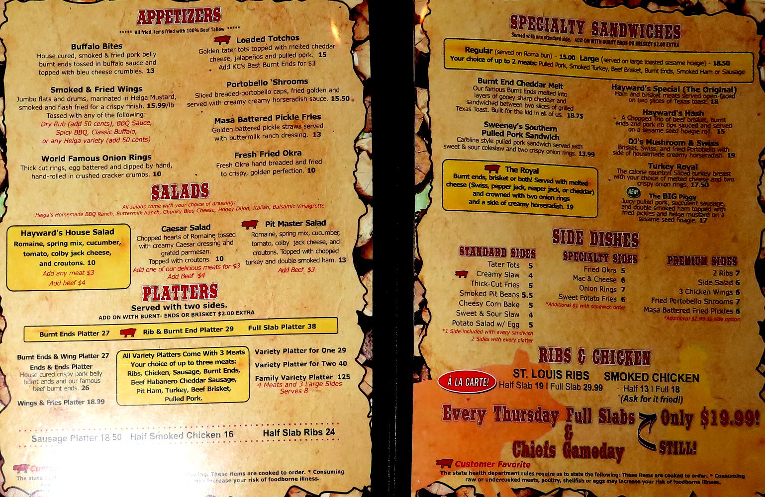 ![]() Hayward's Pit Bar B Que - Shawnee, Kansas Hayward's Pit Bar B Que in Shawnee, Kansas is the oldest barbecue restaurant in Johnson County. it was founded by Hayward Spears Sr. in 1972, and has been in five locations, including a second location at the same time. Hayward owned the restaurant for the first 42 years. The previous locations were all in Overland Park and Lenexa and I dined at all but the very first. I feel the food has ebbed and flowed over the years. I enjoyed it a lot 40 years ago, but about 11 years it slipped and there was a period when I wouldn't have recommended Hayward's, but over time it improved and I am happy to recommend it today. My favorite meats include the pork ribs and smoked chicken, but I particularly like the wings tossed in Buffalo sauce, rub and spicy mustard sauce from Helga Fine Foods in Lenexa. My most favorite meat is only available 3 days a year. The beef in the Corned Beef Burnt End Reuben is brined for 6 weeks and smoked with hickory. The sandwich has a lot of tender, very nicely flavored meat. If you wish to sample multiple meats, there is a variety platter of the choice of three meats and 2 sides for $29 (September 2025 pricing). I recently selected pork ribs, habanero beef cheddar sausage, beef brisket, creamy coleslaw and steak fries. They came out in about 3 minutes! It was a very generous serving of meat, but then it is $29. They also offer variety platters for 2 people, but I think this would be enough for many couples. The pork ribs were my favorite part of the meal - smoky and quite tender. The meats were all served without sauce and they didn't need any added, though I did add some salt. It sounds spicy, but the sausage was actually mild and would have benefited from being served with some Helga's Mustard on the side. The brisket needed BBQ sauce. Haywards offers several specialy sandwiches and regularly offers up something new. My favorite is the Corned Beef Burnt End Reuben which is only offered near St. Patrick's Day. The rest of the year, my favorite sandwich tends to be which ever one had last. The most recent if now the BIG Piggy - pulled pork, sausage, and ham topped with fried pickles and Helga mustard on a sesame seed hoagie roll. The creamy slaw was quite good, Hayward's does a pretty good job with their side dishes. Fries are usually my first choice, but the beans, potato salad and cheesy corn are good choices as well. We also appreciate their not charging an up charge for onion rings on platters ($1 up charge on sandwiches).