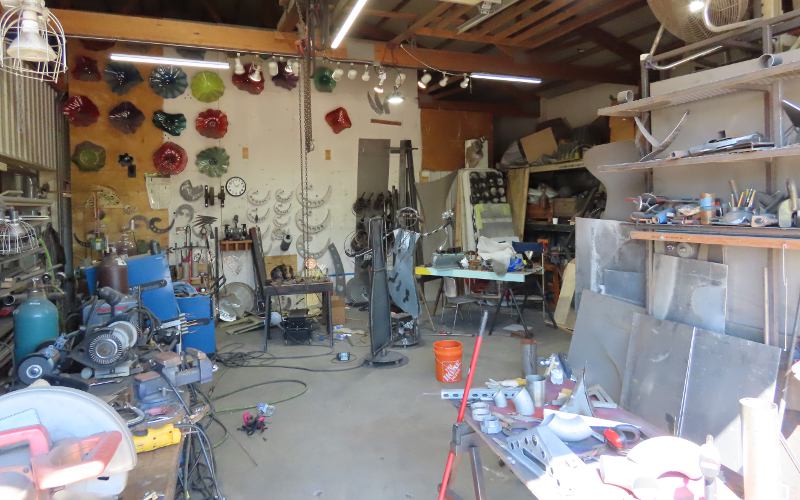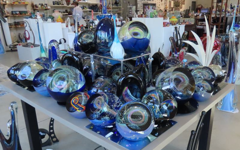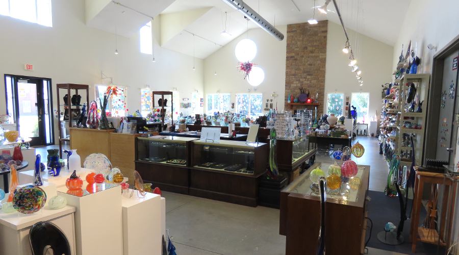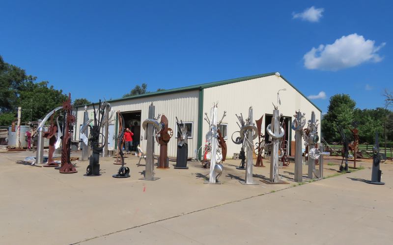 Karg Art Glass - Kechi, Kansas Karg Art Glass is located in the heart of Kechi, Kansas, just north of Wichita. It has a large gallery with art glass produced by many artists and a large studio with many kilns where Rollin Karg's staff of artisans work several mornings a week. Metal work, which is made into separate sculptures or combined with the art glass, is done in a separate building across the parking lot. While trying to visit many attractions, I am usually in and out of a gallery like this in a few minutes, but the large showroom and the glass artists at work were fascinating and I had to drag myself away after a hour. Karg Art Glass offers a variety of classes and workshops for beginner, youth and advanced training in glass work. Their blow-your-own ornament program is available on weekends all year round.
