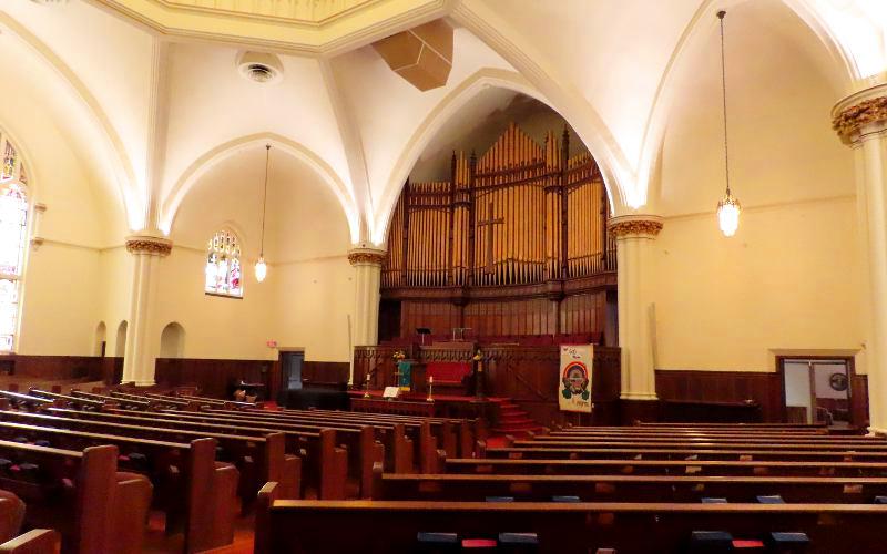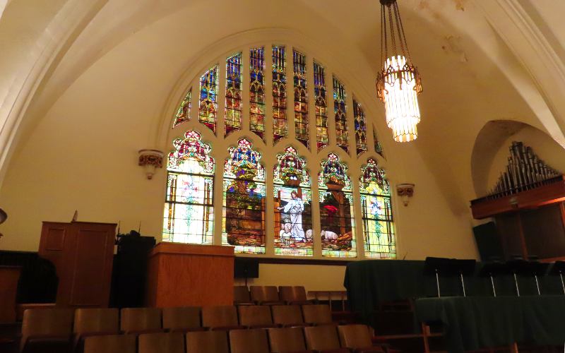 First Presbyterian Church - Wichita, Kansas First Presbyterian Church is the oldest religious congregation in Wichita, Kansas having been organized by 13 members on March 13, 1870. Later that year, the congregation built the first permanent church structure in Wichita. That wooden building is now preserved in the Old Cowtown Museum. The current Gothic Revival style church was constructed from limestone from 1910 to 1912. The impressive sanctuary has vaulted ceilings, stone columns and in impressive central dome ceiling, as well as beautiful stained-glass windows. The church has a separate chapel which was built when a three story educational wing was added in 1936. After I rang the bell, the Office & Facilites Manager admitted me to take photos of the sanctuary and chapel, turning on lights and sharring some of the church history. I was also greeted by the Pastor. They were both generous with their time. If you wish tobe sure you will be able to tour the building, it is a good idea to call in advance.