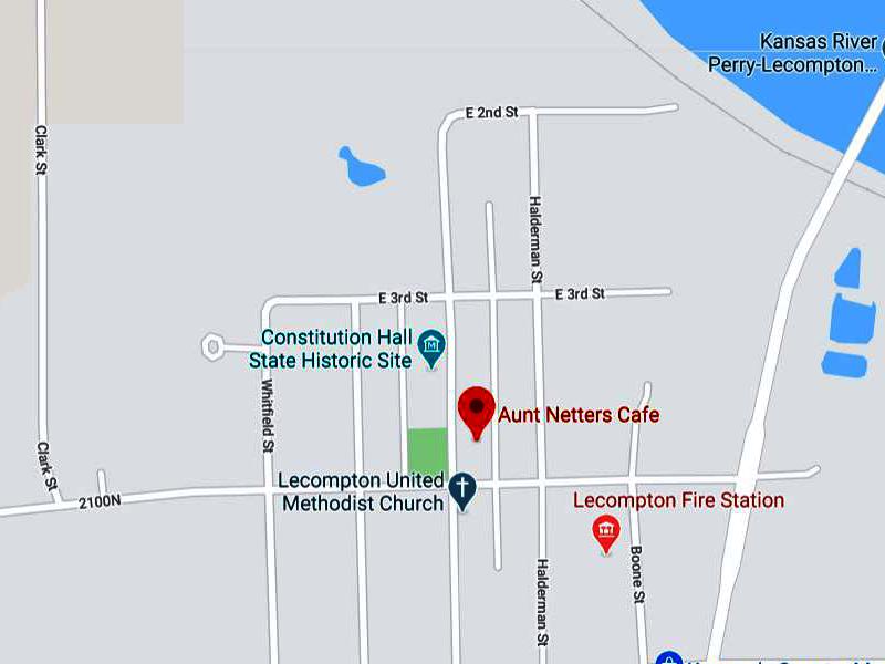 Aunt Netters Cafe - Lecompton, Kansas Aunt Netters Cafe in Lecompton, Kansas is a breakfast and lunch restaurant, serving supper only on Friday. The food is good, but it is on this list of unique Kansas restaurants, because of the wonderful pies. Jamin and Annette Nally started Aunt Netters in 2014. Jamin is the chef and Annette is a school teacher who does the baking in the afternoon or evening, She bakes cup cakes, cinnamon rolls, cookies and pies. In 2025, pie is just $3,50/slice, plus $.50 for a la mode. Whole pies must be ordered two days in advance and are $20. So far we have had the chocolate peanut butter, Dutch apple, cherry and caramel apple pecan. All have been fabulous and we couldn't agree on which one was best. The chocolate peanut butter is rich and the chocolate is not runny, The whipped cream on the chocolate peanut butter pie has something extra, maybe cream cheese? It is tipped with bits of peanut butter cup. So far we have only sampled lunch. The fried catfish was pretty straight forward and we liked the fresh cut fries. The burger was good and grilled onions and jalapenos are a nice option. You order at the counter and the meal is brought to your table. Meal prices are very reasonable. Sandwiches start at $4.99.