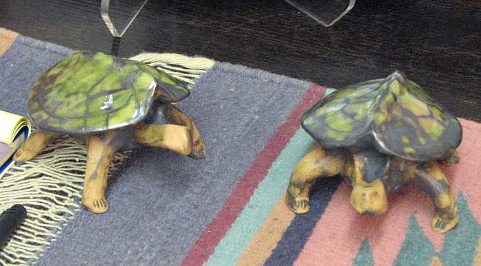 Bow Studio and Gallery - Abilene, Kansas The Bow Studio and Gallery in Abilene, Kansas was operated by a delightful couple from the 1970s until 2012 when Inga Bow passed away at the age of 84. Inga was originally from Austria, she was charming and had a delightful accent, while Bob was down-to-earth and quick to laugh. I enjoyed talking to them as much as photographing the studio and gallery. Today there is an exhibit of Inga's work but nothing is for sale. It is open when Bob is there, but no regular hours. Bob and Inga Bow produced decorative handmade tiles, sculpture, and other art work in various media including handmade paper, collage, pastel, water color and oil paintings. They met and were married in Florida and came to Kansas when Bob was transferred to Fort Riley. They stayed in Kansas, established the Bow Studio and Gallery in 1973 and moved to their present location in 1976 Inga and Bob used local Kansas clays from Ellsworth and Cloud counties in north central Kansas. The clay is dug from the hills of the Dakota formation. The clay deposits contain many fossils of leaves and plants. Bob made turtles almost exclusively, but Inga Bow produced a wide variety of work. I think my favorites are her leaf dishes, which are produced using real leaves. Before leaving, you may wish to check out the junk art which Bob Bow has collected in the yard. These are all found metal objects, unmodified from the way they were naturally created.