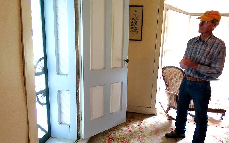 John was joined by his fiancee, Jennie Elizabeth Place, in 1888. They married and had two daughters. The oldest of those daughters, Hilda, lived at the ranch until 1978. The State of Kansas purchased 23 acres of the John Fenton Pratt ranch in 1983, including 5 of the original ranch buildings - the house, stable, bunkhouse, wash house and shearing shed. The same year, the ranch property was listed on the National Register of Historic Places as the John Fenton Pratt Ranch. It is operated today by the Kansas State Historical Society in partnership with Friends of Cottonwood Ranch. The furnishings are the same ones which the Pratt family used and many of them date to the 1800s. John Pratt kept detailed records of daily life, down to where each item added to the home was purchased and how much it cost. For example, the four stained glass windows (the one at right is in the guest bedroom) were purchased from the Studley Lumber Yard in 1896. There are four stained glass windows in the ranch house. Don Rowlinson, who has been the Cottonwood Ranch Curator since 1985, knows every detail of those records. He is a fourth generation Kansas cowboy and is as fascinating to talk to, as the ranch is to visit. We arrived at the ranch just after closing, but he generously invited us in and spent another half hour showing us the ranch house and telling us interesting stories about its history. Although the Cottonwood Ranch House is only open Thursday - Saturday, May through September, the grounds are open daylight hours year around and there are many signs providing details of the history of the ranch.