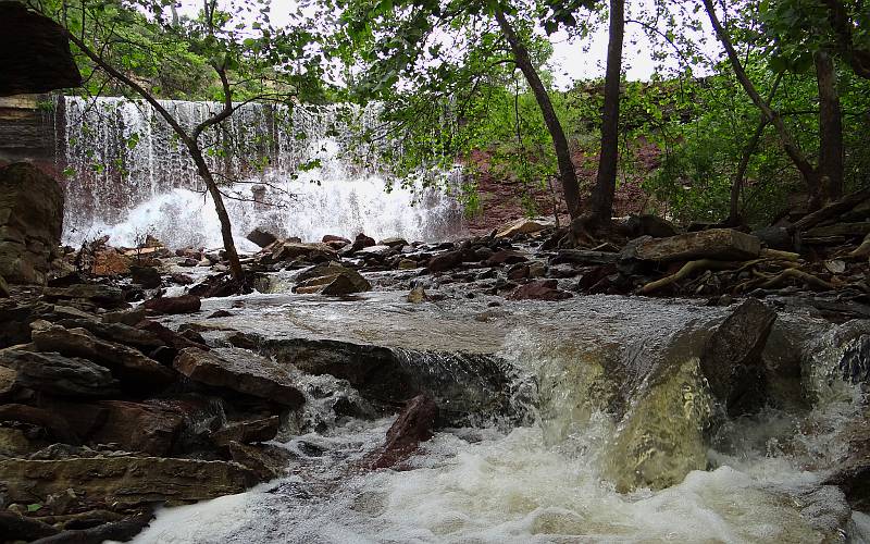 When we first visited the dramatic waterfall at Cowley County State Fishing Lake in 2008, it was virtually unknown and visited by only a few people each day. There weren't even signs at the park pointing out that Cowley Lake Waterfall exists. Returning to Cowley Lake Waterfall in 2015, we discovered that while there were still no signs on US Highway 166, there are now a couple of signs within the park, directing visitors toward the parking above the falls. There were many people visiting the waterfall on the May Saturday we were there, perhaps as many at one time, as there were all day in 2008. Some of the rock face that the waterfall flows over has broken off during the interviening years and the water now travels about half the height of the falls, then hits rock and sprays out. The 25' falls is quite beautiful, but still fairly hard to access, and (because of short sight lines) hard to photograph. Cowley Lake Waterfall is just off the small parking lot at the west end of the 84 acre Cowley County State Fishing Lake. The climb down to the bottom of the waterfalls isn't very safe and you may wish to drive down the dirt road just west of the park. It runs just one or two hundred feet west of the river leading away from the falls. The additional visitors during the past few years have made the climb somewhat easier, and for good or bad, there are fewer trees below the falls. Unfortunately there is a lot of broken glass along the path.