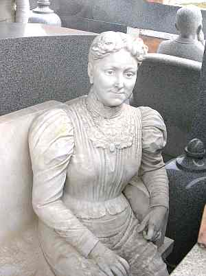 Davis Memorial - Hiawatha, Kansas The most famous attraction in Hiawatha, Kansas is a 1930's tomb sitting in Mount Hope Cemetery near the southeast edge of town. John Milburn Davis came to Hiawatha in 1879 at the age of 24. After a short time, he married Sarah Hart, the daughter of his employer. Her family did not approve. The Davises started their own farm, prospered and were married 50 years. When Sarah died in 1930, the Davises were wealthy. Over the next 7 years, John Davis spent most of that wealth on Sarah's grave. The amount spent on the Davis Memorial has been estimated at anywhere between $100,000 and several times that amount. In any case, it was a large amount and included the signing over of the farm and mansion. This during the Depression when money was tight. Several reasons are offered for the extravagance including great love or guilt, anger at Sarah's family, and a desire that the Davis fortune be exhausted before John's death. The Davis Memorial grew by stages, which is bit of a shame. If it had been planed, it might have been built on a larger lot and be more attractive. The memorial began with a typical grave stone, but John worked with Horace England, a Hiawatha monument dealer, making the gravesite more and more elaborate. There are 11 life size statues of John and Sarah Davis made of Italian marble, many stone urns and a marble canopy that is reported as weighing over 50 tons. The last addition to the tomb was marble granite wall surrounding the memorial to keep people from entering. Unfortunately there wasn't much room left on the lot and the wall is esthetically too close to the figures. The wall hasn't been entirely effective, one of the urns is broken off and the head has been removed from one of the statues. It takes only a few minutes to visit the Davis Memorial and thousands of people do every year. Visitors from all over the world sign the guest register. The Memorial has been featured in newspapers, magazines, television, Ripley's Believe It or Not, and hundreds of web sites, making it one of the best known tourist attractions in northeast Kansas.