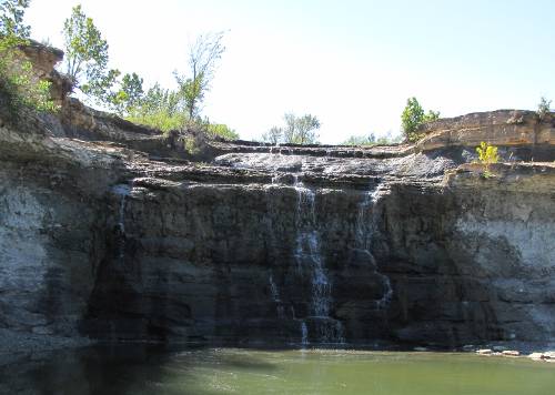 Eureka City Lake Falls on Bachelor Creek During high water, the waterfall at Eureka Lake, north of Eureka, Kansas, is one of the most impressive in the state. So far, I have only been able to visit the falls when there was a the flow or just a trickle of water. Next time we will try to be there when the flow is somewhere in between. During high water, it is difficult getting close to the falls. Eureka Lake Falls is a few hundred feet down Bachelor Creek, which is fed by the the spillway from 259 acre Eureka City Lake. The lake was built in the 1930s as a WPA project. To reach Eureka City Lake and the waterfall, drive north from US Highway 54 on North Main Street. Turn right on East 13th Street, drive about 1/3 mile and turn left on Lake Road. The lake and waterfall are on your left in about 4.5 miles. Thank you to Pat Hogan of Wichita for alerting me to this beautiful falls.