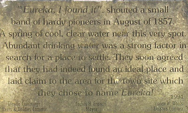 Eureka Spring Site - Eureka, Kansas The Eureka Spring was discovered by pioneers in August of 1857, who reputedly shouted, "Eureka, I found it!" They laid a claim to the area around the fresh water source and it became the community Eureka, Kansas. Today the spring site lies down an alley off of US Highway 54 near Main Street and there is a plaque and stone retaining walls. The spring site is being developed into a park.