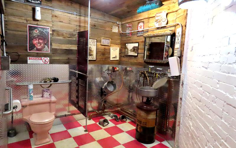 Gearhead Curios - Galena, Kansas Gearhead Curios occupies a 1939 Texaco gas station on Historic Route 66 in Galena, Kansas. They offer Route 66 curios, artwork, cold drinks and welcome travelers on the Mother Road to stop and share their stories. Aaron Perry began restoration of the old service station in 2018 and new things have been done every time we have visited. The work has been creative and include an American flag made from antique Kansas license plates, a 22 foot "Man who wears the Star," nicknamed Big A, and an awning above the gas pump island made from car hoods. One of their newest additions is a functioning rest room which has become a popular place for photo opportunities. About the only thing I see missing is a classic pop machine modified to sell sodas today. Aaron was working in Topeka, Kansas when he purchased the gas station, but has since retired and has moved nearby. Improvements have accelerated now that he lives nearby.