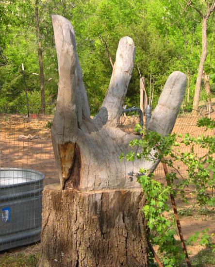 The best thing about building KansasTravel.org has been meeting people like Mary & Glenn Stark of Kingman, Kansas. Glenn makes sculptures in wood and concrete. I first saw his work on display ant the Grassroots Art Center in Lucas, and had exchanged emails with his wife prior to my visit. Glenn was 89 when these photos were taken in 2006. He still seemed quite fit. His hearing was poor, but that wasn't from age. That was from the guns of the USS Maryland in World War II. He was at Pearl Harbor. Much like the other Grassroots artists I have visited, meeting this couple was even more interesting than the folk art. The Starks showed me around their small house. Each room was filled with his art, both miniatures and life size figures. Most of them funny and many have stories. Their yard has many life size figures including Calamity Jane on horseback, a dinosaur, bears, giraffes, a bull rider, and many others. It is easy to pull off US-54 and drive by the Stark home. Several car loads of people came by while I was taking these photos. In 2011, Glenn fell and shattered his right hip socket. It was two months before he could return home and without the strength to wrestle tree trunks and haul cement sacks he lost the drive to do even smaller work. More recently he had another fall, breaking 3 ribs and he is is now confined to bed because his blood pressure is very low. He is not in pain, but he has lived a full life and will turn 97 in May of 2014. You may be able to call ahead and make an appointment for Mary to show you around. Mary is Glenn's second wife and is much younger. Not only will you see the many smaller works that aren't displayed in the yard, but you will get to experience the Starks' humor and joy.