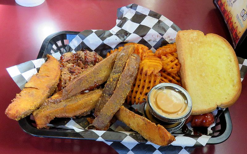 Hickory Hut BBQ - Salina, Kansas Hickory Hut BBQ in Salina, Kansas started business as a drive through only restaurant, operating out of a trailer in 1983. They moved to a building 3 year latter, and finally moved to this location in 2005. They didn't have inside seating until that time, but it appears that much of their business is still done at the drive through window today. They even keep it open a half hour after the dinning room closes. Hickory Hut calls their food "serious barbeque" and we are big fan of their smoked meats. I'm tempted to say my favorite meat is which ever one I am having right now. That said, I am particularly partial to the the sliced pork and the hot Polish sausage. They also have a mild Polish for those who like a little less heat. There are three kinds of barbeque sauces, regular, hot and intense BBQ sauce. They are all sweet, tomato based sauces and the difference between them is fairly subtle. they also provide a Louisiana style hot sauce if you wish to take the heat up a little. The potato salad and (frozen) fries are OK, but the sweet cole slaw is better. The beans are definitely my favorite side dish, sweet and loaded with sausage & a little bacon. I have yet to try the sweet potato fries or potato wedges, but the wedges look quite good. My only complaint about Hickory Hut BBQ is the lack of combination plates. When I go to a barbeque restaurant in a new town, I like to try a variety of their meats, but Hickory Hut's only combination is a two meat dinner. They used to offer several platters which let you have up to four different meat without having to purchase them a la carte. During Covid-19, Hickory Hut has closed half of the tables and are doing a great job of Covid precautions and I felt comfortable in the restaurant.