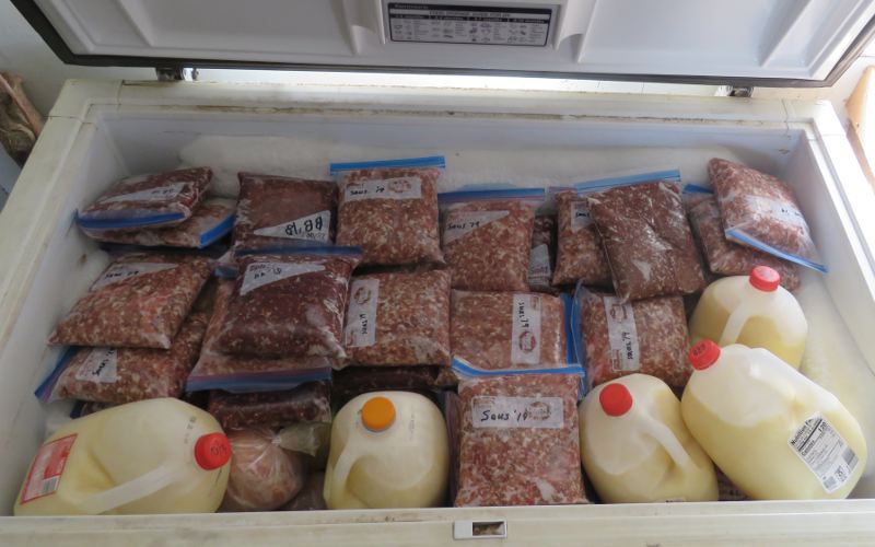 The Potluck store is in the building on the right. The steps on the barn on the left lead to an Airbnb. Archive page only: The Potluck has closed, though Rustic Roost remains open. We visited The Potluck in the country near Partridge, Kansas in March 2019. It is an Amish family farm and dairy which sells raw milk, eggs, meats and other items. The rugged old building housing the store is unattended, with a cash box where you make your own change on the honor system. Instead of change, some customers take a credit and use it on future visits. They even offer handmade gift certificates. The Potluck is not organic, but practices chemical free farming. Some products from nearby farms may also be offered, but they are only from farms which follow similar practices. Dwight and Karen Miller are members of the Amish Mennonite church which is more tolerant of technology. Their congregation even has a web site, though it is very simple, consisting of only a list of recorded sermons and the option of giving online. The services are even available on YouTube Livestream. I was going to buy some sausage and other meats, but there was no price list for the meats and no one was available to ask when I went back outside to look around and take more photos. There was no answer when I called the number on the sign on the wall. The next stop we were making was Grass Springs Dairy, a few miles away, which offers similar products, so I decided to go on. Sadly, when we arrived at Grass Springs Dairy, we learned that it was permanently closed. We definitely planed to stop at The Potluck the next time we are in the Hutchinson area. In addition to trying their products, the Rustic Roost is an Airbnb in the loft of the barn next to the dairy store. The single room B&B is only $75/night. Rather than preparing breakfast for the lodgers, breakfast ingredients (eggs, milk, locally grown pork, homemade bread, butter, jelly, cereal) are in refrigerator and you prepare your own. The Potluck - Partridge, Kansas