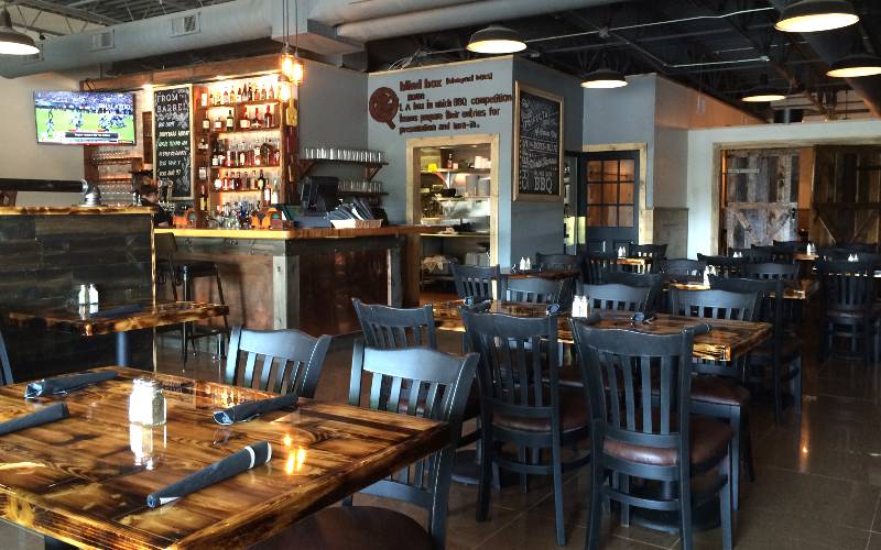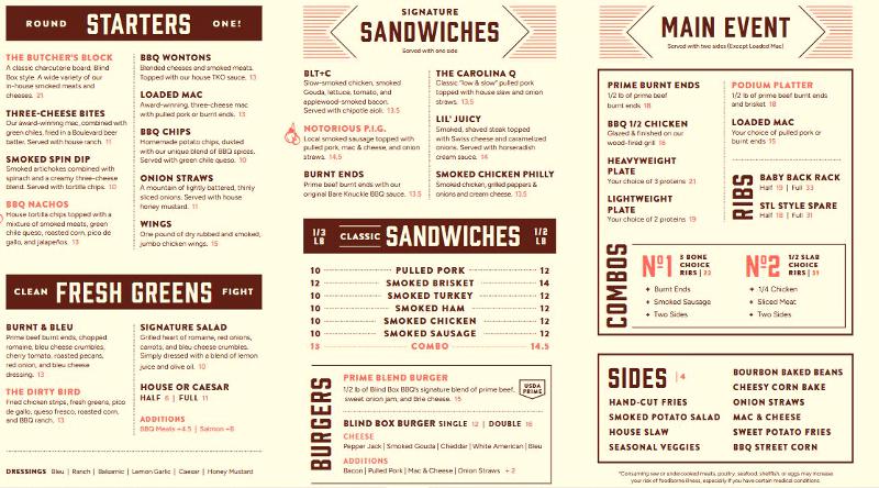 Blind Box BBQ - Shawnee, Kansas Blind Box BBQ, opened August 2015 in Shawnee, Kansas. The restaurant quickly became a worthy addition to the Kansas City BBQ scene and has since added a second location in the Bass Pro at Village West in Kansas City, Kansas. Of the dishes sampled, several stand out: pork ribs (both spare & baby back), smoked chicken, BBQ street corn, and onion straws. I liked the spicy rub on the ribs. They used to have house made French fries which I loved, but have switched to battered fries. The onion straws may be too salty for some people. During my most recent visit, I had a Lil' Juicy - smoked, shave steak topped with Swiss cheese & caramelized onions served with horseradish cream sauce. We also did a side by side comparison of several of the appetizers: The Butcher's Block, Three Cheese Bites, BBQ Chips, Wings, and BBQ Wontons. The Butcher's Block is a large charcuterie board with an assortment of smoked meats, cheeses and fruits. The Three Cheese Bites are mac & cheese with green chilies, deep fried in a Boulevard beer batter. All were good and my personal favorite was a surprise. The BBQ Chips (described as homemade potato chips, dusted with our unique blend of BBQ spices. Served with green chile queso) were very good. The queso went well with them, but I would have liked them even without the cheese. The prices are reasonable. In May 2025, sandwiches run from $10-14.50 including a side dish. Dinners with two sides start at $15 and there is generous combination meal for $22. The best deals at weekday lunch are the Lunch Platters which run $13-14.50. The Pick 2 shown in the photo below in only $13.50. Every Sunday from 9 AM - 2 PM they offer a Brunch Buffet in Shawnee. In addition to breakfast items, they offer several items from the regular menu plus a chocolate fountain, fresh fruit and pastries. $30 for adults (2 for $55) and $16 for kids.