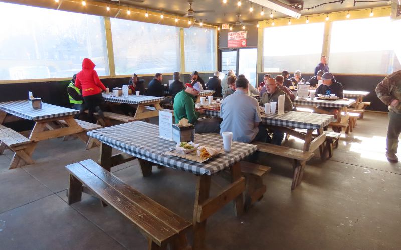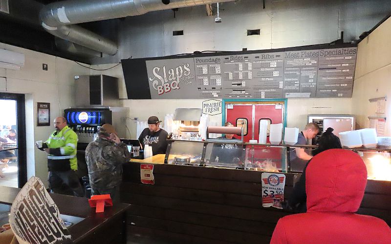 Slap's BBQ - Kansas City, Kansas Slap's BBQ in the Strawberry Hill neighborhood of Kansas City, Kansas has been very popular since opening in June 2014. We first went to Slap's a few months later, but there was a long line standing in the rain. Over time, the dinning area has been expanded with a covered patio and they have learned how to prepare the food much faster. In 2020 they added more outdoor dinning on the roof of an out building and replace the on site parking with picnic tables. Slap's has greatly expanded the hours they are open over the years. We have not had an excessive wait in several years. The restaurant is operated by brothers Mike and Joe Pearce, who are members of the Squeal Like a Pig BBQ competitive barbecue team/ Three members of the team opened the restaurant, though only the brothers are there today. "Slap's" is made from the first letters of Squeal Like A Pig. The team still competes, but not as often as they once did. My favorite item, by far, is the ribs. The St. Louis style cut pork ribs are tender and have an excellent slightly smoky flavor that has been well seasoned with their rub. The sausage is also very good. The large chunks of burnt ends have been the least exciting meat. They taste good, but are more mildly seasoned than is typical in our favorite Kansas City burnt ends. The sauce is the most unusual thing about this barbecue. It is a thin, very sweet sauce like that served with some appetizers in Chinese or Thai restaurants. That standard sweet sauce goes well with the smoked turkey, but on the other meats I prefer the spicy sauce, though the meats are good without any BBQ sauce. The beef brisket is their most popular meat and I enjoy it nearly as much as the ribs.. If you get the pulled pork, ask the person carving the meat to add au jus. The baked beans are meaty, but a bit too sweet for our tastes, but Slap's offers jalapenos pepper slices if you have the beans and I thought the peppers made the beans very good. The fries are lightly battered and the only part of the meal which I don't bother to finish. The cheesy corn is excellent with just a touch of salt. The warm baked potato casserole is the only unique side and is our favorite side, by far. The cashier came around to talk to us during one of our early meals and explained that she was the mother of the brothers who at the start were two of the three original owners. She is a real estate agent and her work schedule provides the flexibility to let her help out during the four hours Slaps was then open each day. She brought us samples of their hushpuppies and the house cheese spread for dipping. The hushpuppies tasted good and added a nice, slightly crispy compliment to the meal. On Tuesdays the special is Burnt End Street Tacos - deep fried burnt ends, sautéed pepper and onion, and Slap's special taco sauce. Slaps says this is their most popular daily special. 3 tacos and one regular side for $12.95 (in January 2026).