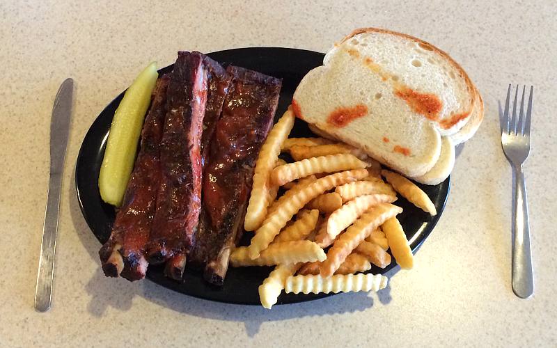 lunch speical is BBQ Ribs served with fries, bread, pickle, and regular