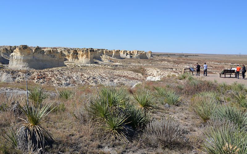 Little Jerusalem Badlands State Park - Scott City, Kansas The highly anticipated Little Jerusalem Badlands State Park opened on October 12, 2019. It is a mile long jumble of 70 feet tall sedimentary formations of Niobrara Chalk which were created by the erosion of the sea bed which formed during the Cretaceous Period, 80 million years ago. Kansas' newest state park is located midway between Oakley and Scott City, Kansas, just a few miles west of Monument Rocks. Owned by the Nature Conservancy, Little Jerusalem Badlands is the first Kansas State Park which is privately owned. The new park is managed from Lake Scott State Park, which is about 6 miles south. Admission to the park is by Kansas State Parks Passport or a daily vehicle permit. The daily permit is $5 ($3.50 for age 65 or older) and it can be paid using envelopes and a drop box near the entrance. The far corner of the parking lot gives a distant view of the badlands. There are trails which lead to spots which look down on the badlands. The lookout in the photo below is at the end of a hard packed 1/4 mile trail. There are two other lookouts, one is accessible by a 2/3 mile packed trail, and the other is accessible by an unimproved trail leading another 1/2 mile from that one. Access will probably be expanded in the future. Visitors are not permitted to leave the trails, except on guided tours. Spots on the guided tours can be scheduled by calling (620) 872-2061. Times available can be found by clicking on the calendar icon on this page. The tours take 1.5 - 2 hours and do not follow a set route, to minimize impact to the environment. Participants should wear long pants & closed toe shoes, and carry water. You will be going through grass & brush, climbing over rocks, up and down steep slopes. The photos below are from a tour on October 19, 2019. Be advised, the rest rooms at the park were not open, due to low water pressure. The closest rest rooms are at Lake Scott Park.