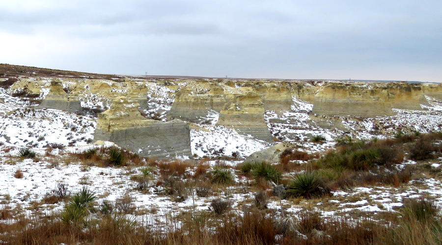 End of Overlook Trail Little Jerusalem Badlands State Park is a mile long jumble of 70 feet tall sedimentary formations of Niobrara Chalk which were created by the erosion of the sea bed which formed during the Cretaceous Period, 80 million years ago. Kansas' newest state park is located midway between Oakley and Scott City, Kansas, just a few miles west of Monument Rocks. Owned by the Nature Conservancy, Little Jerusalem Badlands is the first Kansas State Park which is privately owned. The new park is managed from Lake Scott State Park, which is about 6 miles south. Admission to the park is by Kansas State Parks Passport or a daily vehicle permit. The daily permit is $5 ($3.50 for age 65 or older) and it can be paid using envelopes and a drop box near the entrance. The far corner of the parking lot gives a distant view of the badlands. There are trails which lead to spots which look down on the badlands. The lookout in the photo below is at the end of a hard packed 1/4 mile trail. There are two other lookouts, one is accessible by a 2/3 mile packed trail, and the other is accessible by an unimproved trail leading another 1/2 mile from that one. Access will probably be expanded in the future. Visitors are not permitted to leave the trails, except on guided tours. The guided tours can be scheduled by calling (620) 872-2061. Free tours are available year around on weekdays, with some weekend tours in May - September. This park is brand new, so that may change. The tours take 1.5 - 2 hours and do not follow a set route, to minimize impact to the environment. Participants should wear long pants & closed toe shoes, and carry water. You will be going through grass & brush, climbing over rocks, up and down steep slopes. The photos below are from a visit on February 18, 2021. It had been a couple of days since the last snowfall, but there had only been two people on the Overlook Trail and the only tracks on the Life on the Rocks Trail were from animals. Be advised, the rest rooms at the park were not open. The closest rest rooms are at Lake Scott Park 20 minutes away.