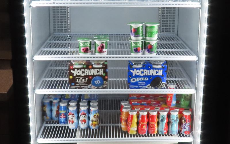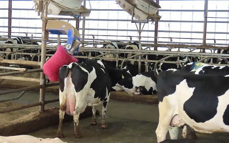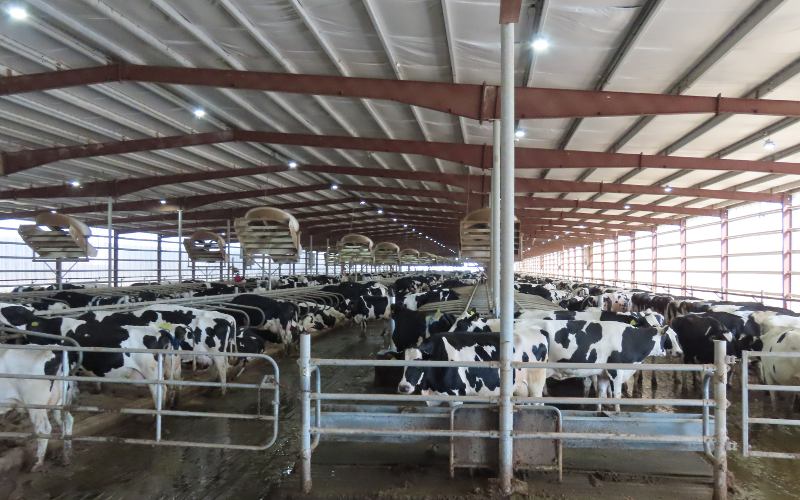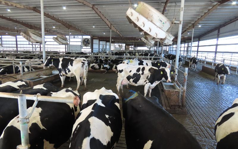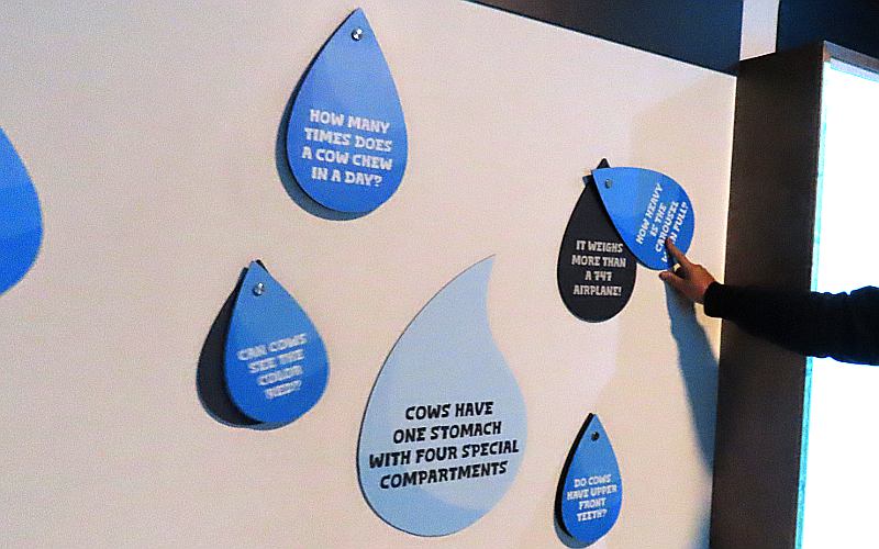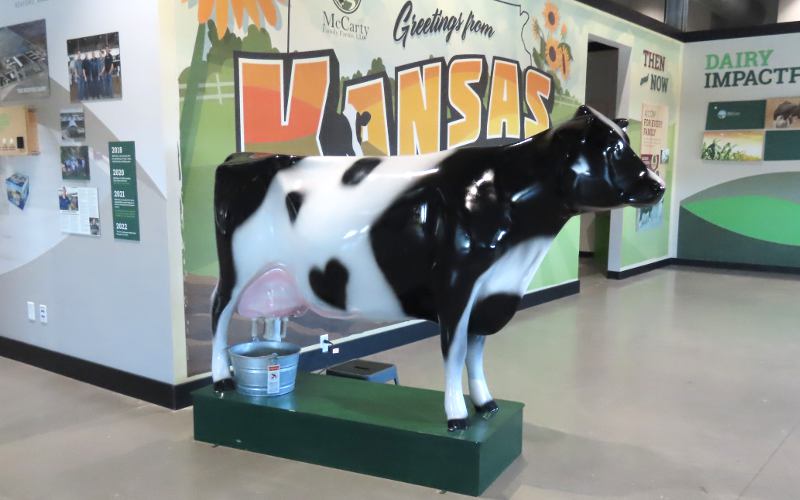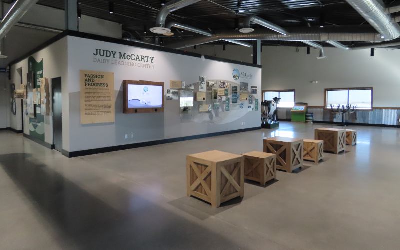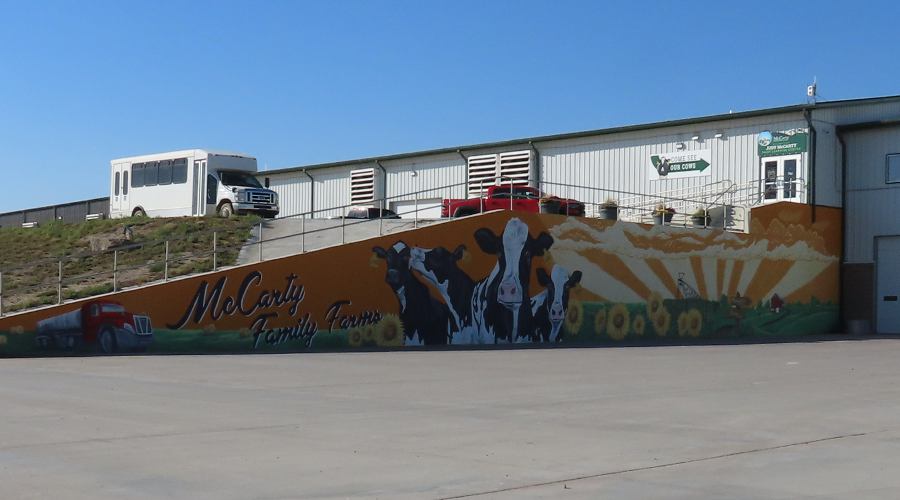 McCarty Family Farms 120 stall milking carousel - Rexford, Kansas McCarty Family Farms is a 4th generation dairy farm headquartered in Rexford, Kansas with additional facilities in Beaver City, Nebraska and Bird City & Scott City, Kansas. There are 10,000 Holstein cows at this location. The Judy McCarty Dairy Learning Center is named for the late mother of the four brothers who own McCarty Family Farms. The Learning Center opened in June, 2024 and there is no admission charge nor request for donations. Visitors are welcome to drop in. As you arrive at the Learning Center, there is a sign saying "Come See Our Cows." The Learning Center has galleries with interactive educational displays, a gift shop, and a glass wall overlooking a 120 stall milking carousel. It is fascinating watching the cows enter the room, board the carousel, and take an 8 minute ride while being milked. When the carousel takes them back around, they back out and walk back to their barn. The carousel operates 22 hours a day and each cow is milked three times a day. The dairy has two of these enormous carousels. In addition, free tours are offered to groups of 12 or more by appointment. The tour is in a small, modern bus. We were surprised to learn that the entire tour is done in the bus, which drives through several tunnel ventilated freestall barns housing 1,250 cows each. "Freestall" barns have individual stalls for rest and sleep. The cows select their own stall and move freely between the stalls, eating areas, and milking parlors. There are even cool brushes where cows can get a back rub. The fans cooling the barns are maintained at a speed that keeps away flies. Everything is done to keep the cows calm, contented, healthy and productive. The tour also goes through the area where feed is carefully mixed, the sand used for bedding is reclaimed, water is reclaimed, and enough methane is captured to power 12,000 homes. The manure is used as fertilizer at neighboring farms. The milk produced at this facility and McCarty's three other dairies is condensed at McCarty's own Condensing Plant across the highway. The condensed milk all goes by truck to the Danone plant in Fort Worth, Texas where it becomes Danon and other yogurt products. A tour concludes back at the Learning Center with a chance to try one of the many products Danon produces from McCarty milk. We had a Oikos 20g Protein Peach Yogurt Drink and YoCrunch Vanilla Low Fat Yogurt with Mini M&Ms. Visitors who don't take the tour, still get to choose a treat.
