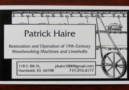 Neosho Valley Woodworks - Humboldt, Kansas Neosho Valley Woodworks is a master artist's studio, furniture & millwork shop, and living museum in Humboldt, Kansas. As we walked in the front door on a hot summer's day, we found master carpenter Pat Haire making a kitchen cabinet which we later learned was for his own kitchen. He generously stopped working to show us around the fascinating studio and 19th century manufacturing facility. The woodworks is filled with vintage machinery from the late 1800s. These aren't what you would normally think of as power tools, but powered by lineshafts, with leather belts running between the equipment and various pulleys. Pat shared the history of his woodworking shops. He first created one in Iola, Kansas but found himself needing to sell the machinery to pay off the building. He started over in Humboldt at the Landers Wagon and Carriage Shop which we photographed earlier in the morning. He located more belt driven Victorian machinery from locations all over the midwest and with the assistance of his brothers restored them for use. More recently the shop was moved into this location on the Humboldt Square and the woodworks building is still being restored. In addition to woodworking machinery, the two store fronts are filled with some of Pat's finished works, a few pieces of antique woodwork (including a secretary which was manufactured in the 1800s at a factory in Humboldt owned by Utterson and McLeod), and Pat's Kansas prairie grass art. Touring Neosho Valley Woodworks is like visiting a shop in Dearborn's Greenfield Village or Historical Williamsburg. Though none of the 150 year old machinery was being used this morning, Pat started some up briefly so we could see, hear and video the equipment, belts and pulleys in operation (see below). The open power train is perilous enough that there are few mills anywhere where they can be seen in operation. We enjoyed over an hour of exploring the shop with Pat. I was concerned about his taking so much time away from his carpentry, but learned that has been cutting down on the number of projects he is doing and lately has limited them to work for the local community, where among other things, he has been making many doors for building restoration. A recent project is a commission to make baseball bats with a custom Humboldt logo on the barrel. Pat is trying to find a way to produce them at a price where local children could afford to purchase and use them.