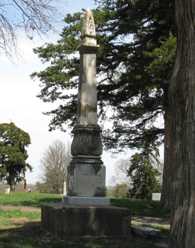Then over near the roadway to the southeast to the grave of James H. Lane, who was the first U.S. Senator from Kansas. Lane was a US Army Officer and a Senator at the same time. His grave is marked with an 1870 three part, white marble obelisk which was made in Lawrence.