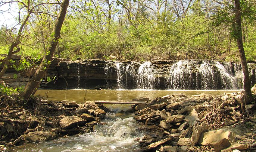 Cedar Lake Falls - Olathe, Kansas Cedar Lake Falls is located in the spillway just below the Cedar Lake dam in Olathe, Kansas. It is the second of four waterfalls which were pointed out by Randy Rasa of kansascyclist.com. I am almost embarrassed to say that years ago I regularly fished next to the Cedar Lake overflow dam, but never realized that there was a waterfall just a short way down the spillway. Cedar Lake is a 75 acre lake surrounded by a 54 acre community park which was originally dedicated in 1920. To reach the falls, enter Cedar Lake Park on the access road off of 159th and follow it along the south shore of Cedar Lake all the way to its end near the dam. There is an undeveloped trail which leads northwest from the turn around, paralleling the spillway. There are a couple of places where Cedar Lake Falls can be glimpsed from the cliff that lines the spillway, but there is no easy way down the bank. For the best view, continue along the pathway, downstream past the falls until it crosses an off shoot of the spillway that is usually dry. Turn right and follow it along its bed and it will lead you to the creek below the falls.