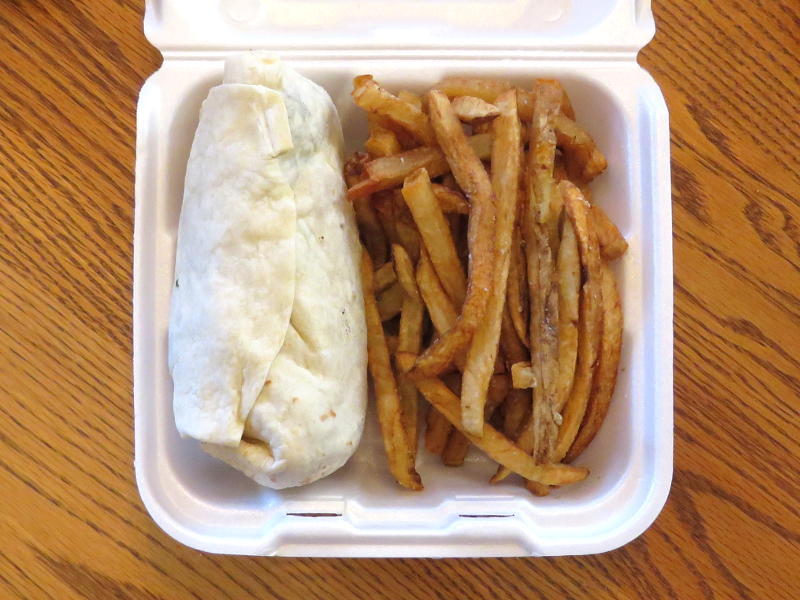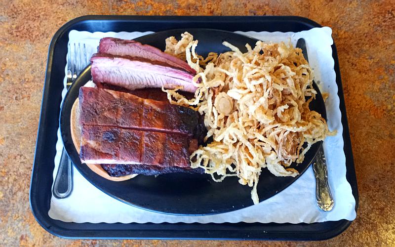 The Rub Bar-B-Que - Olathe, Kansas The Rub Bar-B-Que in Olathe, Kansas is a great barbecue restaurant which should be much better known. I've been dining there since it first opened and although I miss the smoked meat loaf they served during the first few years, they still have many great meats. You order at the food preparation counter, reading the menu above. Your plate is prepared in front of you and when you get to the cash register, the food is ready for you to carry out or carry to your table. Fountain drinks are self serve in plastic cups, so I always leave with a full cup of pop. There is a second dining room in addition to the one shown in the photo below and this restaurant can accommodate large groups. Our most recent meal was in early 2025. Wanting to sample a large portion of their menu, we ordered a Ultimate Platter which for $29.99 includes 4 ribs, 1/3 lb. burnt ends, 1/3 lb. pulled pork, 1/3 lb. sausage with 3 sides. It is intended to serve 3-4 and we took over half of the meat home for later. At about the same prices as two platters, it is a nice meal for a small family. All of the meats were good. Neither of us are big pulled pork fans. There was moist and well flavored, but we liked the other meats more. The sausage is very well seasoned, among our favorites throughout Kansas City. The ribs have a great flavor from both rub and smoking, but I still like adding a little of their sauce. They are tender, with what I think is about the perfect amount of still clinging a little to the bones, rather than falling off. The burnt ends are less fatty than many places and do not have a smoke ring. Our sides were fresh cut fries, house made onion straws and BBQ pit beans. The fries are my favorite. The onion straws are good and I continue to get them, but I wish they were just a little less salty. The first time I had the beans and saw that they were a mix of three kinds of beans, I thought, "I'm not going to like this," but I was wrong. The beans are slightly sweet and very good! One of the newer dishes at The Rub is the Burnt End Burrito, which is made with beef burnt ends, potatoes, Jalapeño cheese and pico de gallo wrapped in a tortilla. It is a generous serving and quite tasty for only $12.99. It had a nice flavor from the seasonings and smoking and I enjoy it as served. It has just the right level of juiciness and it doesn't really need the salsa and sauce which come on the side. I like the burrito even better when the leftovers are reheated and topped with a little Sriracha. I've considered taking some Sriracha there with me. The $12.99 Fat Boy (Jumbo sausage and pork sandwich topped with Carolina slaw, homemade fries and buffalo hot sauce) is one of my favorite sandwiches at any Kansas City BBQ restaurant. The richly flavored sausage is the star of the sandwich. The only chicken offered is chopped chicken. This isn't the style of BBQ chicken I prefer, but it is still surprisingly good. The tomato based sauces are sweet with a little spicy. Although I am usually a fan of spicier sauce, I usually use the regular, most often to dip the fries. My only criticism is the plating isn't very attractive, but as long as they are filling the plates with such generous servings, its hard to complain.
