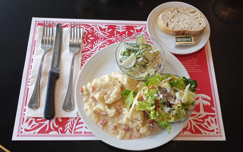 Andre's Confiserie Suisse and Rivaz Tearoom - Overland Park, Kansas Andre and Elsbeth Bollier immigrated from Basel, Switzerland to Kansas City in June of 1955, and opened typical a Swiss Confiserie south of the Country Club Plaza at 5018 Main Street in Kansas City, Missouri in October of that year. Andre's quickly became a Kansas City tradition. Over the years, a tea room serving a light Swiss style luncheon was added and franchises open in California, Colorado and Texas. Andre's daughter Brigitte and husband Kevin opened Andre's Confiserie Suisse in Overland Park, Kansas in 2002. Andre's Rivaz Tearoom serves only Monday - Saturday lunch, and the menu is limited to a Quiche Lorraine, cheese pie and a couple of daily specials. Visit the Tearoom web site for the menu or see below for the selection from September 1, 2021. Andre's authentic Swiss lunches served 11AM - 2:30PM. Desserts and beverages are served from 11-4. Lunch including entree, coffee or tea, sides and dessert is $19.30 including sales tax. At one time the servers brought a tray of about 6 desserts to the table for customers to choose from, but on my most recent visit, I ordered off the menu from a list of nine different pastries and several cookies, including 6 gluten free options. I went with Matterhorn, a blend of chocolate cake and chocolate butter cream with a butter cookie base. Although the dessert was small, it was was very rich with a really wonderful chocolate flavor. I took small bites to savor every bit of it and was quite satisfied. Expect to wait for a table even if you arrive early. But during my recent visit the wait was short and the line never had more than a few people. Dining is available inside and out. Large windows make the inside bright and friendly. But the Confiserie Suisse appeals to everyone: chocolate candies, French pastries and tortes, all made at the two Andre's locations. A video playing in the background shows the candy making process. Many of Andre's products can be purchased online.