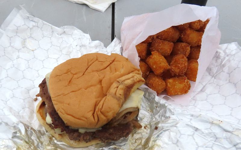 Grandstand Burgers - Overland Park, Kansas Grandstand Burgers in Overland Park, Kansas is located just a couple of blocks north of I-35 at the corner of Antioch Road and Merriam Drive. Many people confuse the location with Shawnee or Merriam, but it really is in Overland Park. The carry out only restaurant opened in 2002 and is a tiny place with no seating though in the early years 2 or 3 people could eat at the small counter, but there are four picnic tables out in front. That doesn't keep people away. The line to order has gone out the door much of the time during some of my visits and a 30 - 40 minute wait for food is not unusual. The kitchen is equally small, but very busy. On the first visit, four people were working in a space smaller than the kitchen in a small apartment. The small size does limit what they can do - other than the handmade hamburgers, it appears that most everything else is cooked from frozen. I have sampled the 1/3 pound cheeseburger on multiple visits. On my first visit, the burger was over cooked to the point of being dry and slightly tough. On the second try, I asked if they could cook it medium, and they said they could cook it to only 168 degrees on request. It was still well done, but not over done and quite enjoyable. I recommend everyone request the 168 degree burger, even those who prefer well done. The hand burger patties are freshly hand formed, but with the tiny kitchen, most other items are are made from frozen. The onion rings are quite good for made from frozen, but the hot wings and French fries are less - I didn't care as much for them as for what I can prepare myself from frozen at home. I recommend skipping the fries and going for the tater tots! The tots are long, flat and about a third of the thickness of other tater tots and shaped like Tetris pieces. They are crispy and have more flavor than most tots. My personal favorite burger is the Grandstand Philly (Swiss Cheeseburger, grilled onions & Philly meat). The Polish sausage (ask for grilled onions) is great as well. The pork tenderloin doesn't appear to be hand breaded, but it is one of the better pork tenderloins in metro Kansas City. Tender and with a batter which has great flavor.
