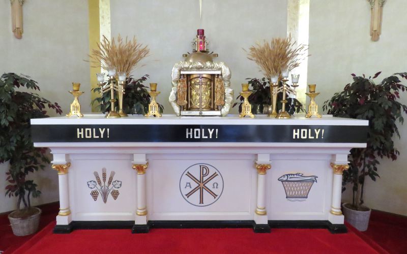 The first church had foundation problems from the start and was replaced in 1881. Construction of the beautiful present building began in 1900, using native stone, quarried in the area by members of the congregation under the direction of Father Emmeran Kausler. The church was dedicated on June 13, 1901. The church suffered from fires in the 1920s and 1932, but 1920’s. The church was rebuilt after each fire and gold capped arches and abutments were added following the second fire. The church has Gothic windows. St Anthony Church is normally open only during services, but tours can be scheduled by appointment at 785-625-5451. The adjacent school house was built from native limestone in 1912. The Schoenchen school district was founded in 1880. It was a public school, supported by taxes, but the students and teachers were Catholic and the priest from St. Anthony provided religious instruction during school hours. By the time that this building was erected, the teachers were nuns, who lived in an attached convent. In time, there was separation of the schools and the church. Since 1995, students from Schoenchen attend school in Hays, Kansas. The model in the photo at the top of this page is an exact replica of St. Anthony's Church mad was created by Ronald Sauer, a member of St. Anthony's Parish Council. It is constructed from the same stone used to build the church.