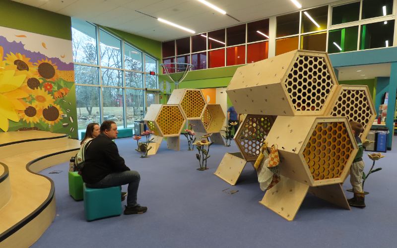 Kansas Children's Discovery Center - Gage Park, Topeka, Kansas The mission of the Kansas Children's Discovery Center in Topeka, Kansas is to enhance the lives of children; inspire creativity and a lifelong love of learning; enrich the health of our community through education; and provide an exciting and safe place for families to learn, play and interact together. You must be accompanied by a child to visit the year and a half old children's museum. The hands on exhibits, camps, and daily programs in the 30,000 square foot building are very cool. There are also 4.5 wooded acres of obstacle courses, hiking trails, an enormous tree house, planting beds, stage/classroom, butterfly rain gardens, and trike paths. Tricycles are provided for children and adults at no additional cost. Construction will start soon on an outdoor water feature that will include ponds, streams and gardens. We were particularly impressed with the Build Gallery where children can do woodworking with real tools and make things to take home, and the Careers Gallery with a car repair shop where they can check the engine and change the tires on a small car. The Science Gallery with its air mazes, plasma globe, Bernoulli blowers, wind tube and experiment tables is also very nice. The Center regularly has special exhibits and the ones