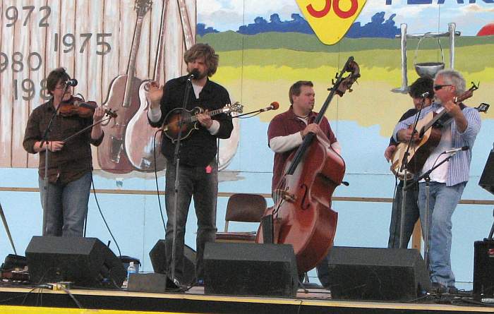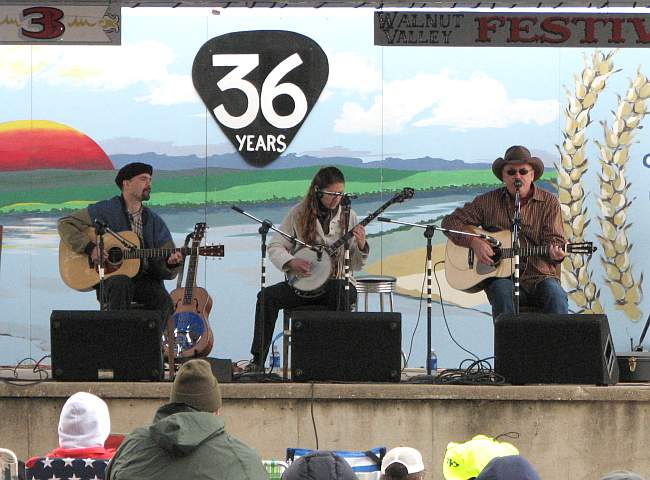 Vermont based folk group, Woods Tea Co on Stage 1 at the Walnut Valley Festival. With around 15,000 attendees, the Walnut Valley Festival in Winfield, Kansas is one of Kansas' largest seasonal events. Although officially a four day event, Walnut Valley attendees start assembling at the Festival nearly a week in advance and a music crawl is held in downtown Winfield on Tuesday evening before the Festival. The 53rd year of the bluegrass and acoustic music festival will be September 17-21, 2025. Walnut Valley Festival hosts international acts, championships for instrumental performance such as bluegrass banjo & old time fiddle, and well over 100 food, crafts and music venders. The Walnut Valley Festival has 4 official stages and several less official. Stage 1 has the grandstand, but there is music everywhere with multiple options at the same time. It is unusual to walk more than 50 paces and not hear music coming from somewhere.