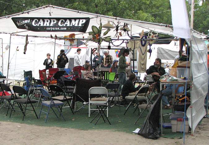 Small part of Pecan Grove Campground at Walnut Valley Festival - Home of the Unknown Picker camp at right. For many campers, the Walnut Valley Festival will begin Saturday, a few days before the official Festival, when campers take part in the Walnut Valley Festival Land Rush, an annual race for the best fairground camping sites. In 2007, over 700 campers were in line when the race began. The campgrounds at Winfield, Kansas, some of which line the shore of the Walnut River, are the temporary home for perhaps half of the people attending the Walnut Valley Festival. For many people the activities in the Festival campgrounds are the best part of the Walnut Valley Festival. There are a wide variety of camps, from a single tent to very elaborate combinations of RVs and other equipment. Some of the camps are decorated to great lengths and there is a competition for which one is the most fun. Although most of the campers at the Walnut Valley Festival have known each other for years, newcomers are welcomed and likely to receive offers of food or beverages. It is a great place to hear or participate in informal music performances. You are likely to hear bluegrass, Celtic music, folk music, cowboy songs, gospel and more. You will also encounter some of Walnut Valley Festival's professional performers, as this is their opportunity to relax and spend time with friends and other performers. The activities range late into the night. One camper said that "you don't come to Winfield to sleep." Every year since 1995, Radio KWVF (Kansas Walnut Valley Festival) broadcasts at 105.7FM, beginning Wednesday afternoon before Land Rush Thursday until the final day of the Festival.