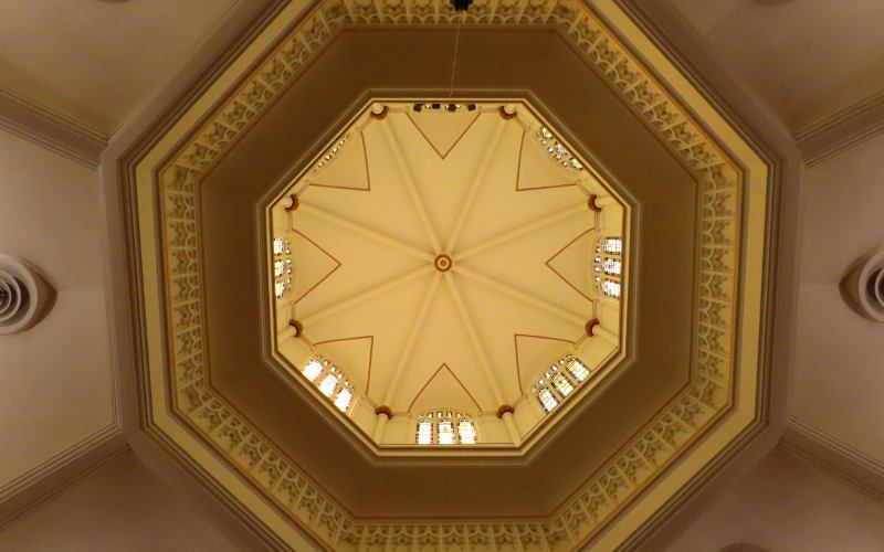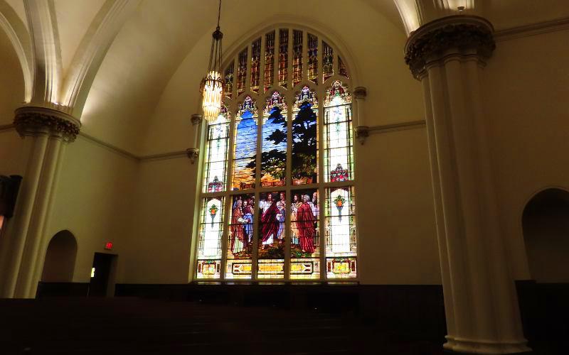 First Presbyterian Church - Wichita, Kansas First Presbyterian Church is the oldest religious congregation in Wichita, Kansas having been organized by 13 members on March 13, 1870. Later that year, the congregation built the first permanent church structure in Wichita. That wooden building is now preserved in the Old Cowtown Museum. The current Gothic Revival style church was constructed from limestone from 1910 to 1912. The impressive sanctuary has vaulted ceilings, stone columns and in impressive central dome ceiling, as well as beautiful stained-glass windows. The church has a separate chapel which was built when a three story educational wing was added in 1936. After I rang the bell, the Office & Facilites Manager admitted me to take photos of the sanctuary and chapel, turning on lights and sharring some of the church history. I was also greeted by the Pastor. They were both generous with their time. If you wish tobe sure you will be able to tour the building, it is a good idea to call in advance.